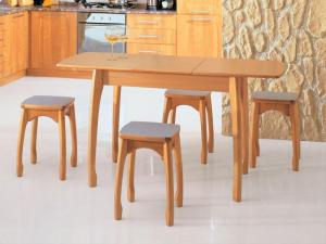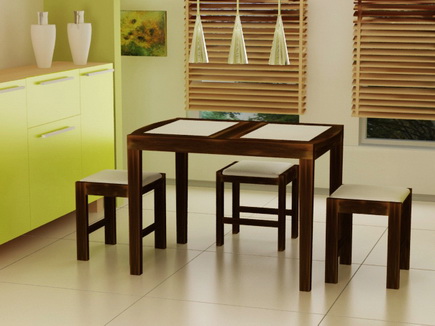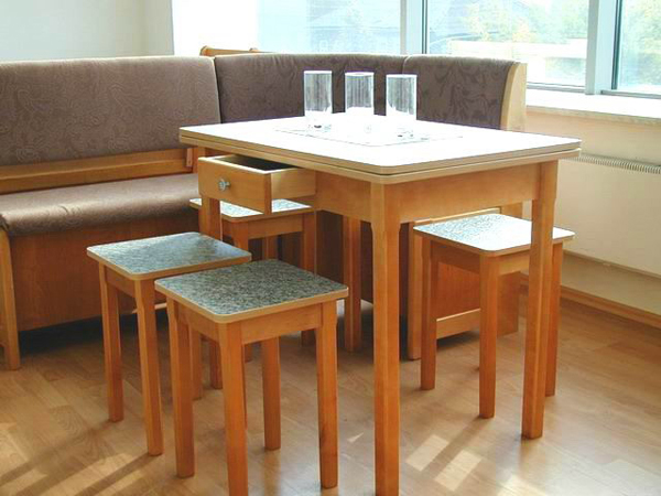 Las mesas de cocina están disponibles en diferentes tipos. Los populares son los juegos de bistro, mesas agrícolas y los juegos de la esquina rincón. Bistro es un conjunto propio de la decoración moderna, dado por una tabla de perfil alto con taburetes a juego. Puede ser de madera, hierro forjado, metal o una combinación de estos materiales.