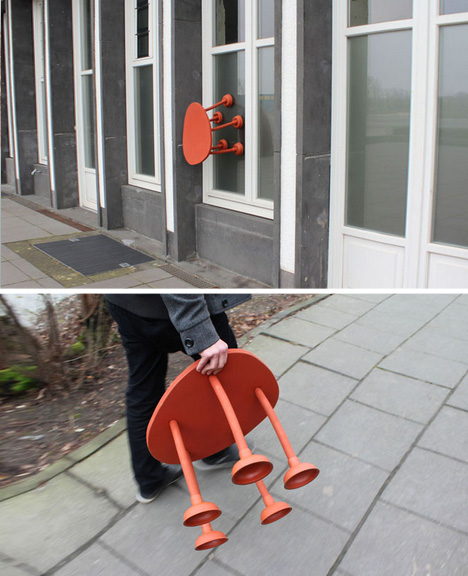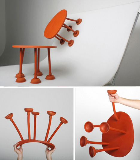 Lo que estas viendo es real, no es ninguna broma. El diseñador Thomas Schnur ha tratado de dignificar a los chupones típicos que se utilizan en los cuartos de baño, dándoles una nueva utilidad, formando equipo con el mobiliario del resto de la casa. Así nace esta mesa-taburete que gracias a esos chupones puede adherirse a cualquier superficie con sus cinco patas succionadorass, tal y como vemos en las fotos. Ahora solo te queda buscarle una utilidad a tener la mesa en la pared.