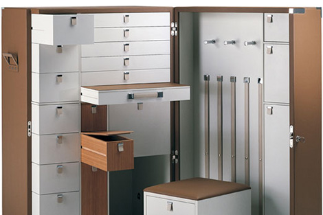 Poltrona Frau presenta un interesante armario para dormitorio con un toque retro. Inspirado en los armarios que se usaban en los antiguos transatlánticos, este armario es ideal para habitaciones con poco espacio.
