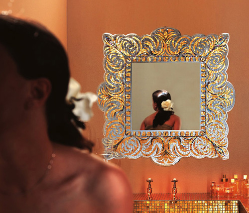 Los componentes básicos incluyen Plexiglas, mosaicos de cristal hechos de azulejos y oro de 24 kilates. Estos diseños convierten un simple espejo en una gran pieza de decoración, jugando con los reflejos de la luz.