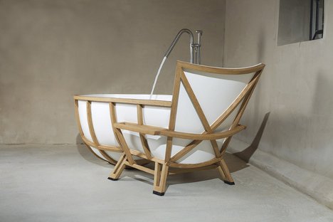 Después de un duro día de trabajo, lo único que queremos es tumbarnos en nuestro sillón favorito a descansar, o tomar una ducha relajante en nuestra bañera. Ahora, gracias al «invento» del diseñador Thomas Linssen, podemos combinar ambos placeres en esta original bañera-sillón, en la que cada baño será el doble de relajante. La estructura de madera se combina con el elegante diseño de la propia bañera para proporcionar un mueble perfecto para colocarlo en nuestro baño.