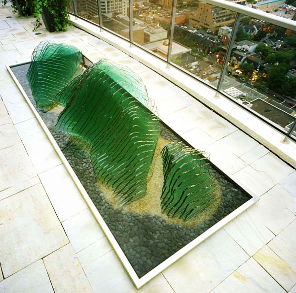 El «Glass Rock Garden» (Jardín de roca de cristal) es una pieza de oba modernista. Este ejemplo en concreto está situado en un tejado, en el centro de un pequeño estanque con fondo de piedras grisáceas, haciendo un bonito contraste con las placas de cristal verde.