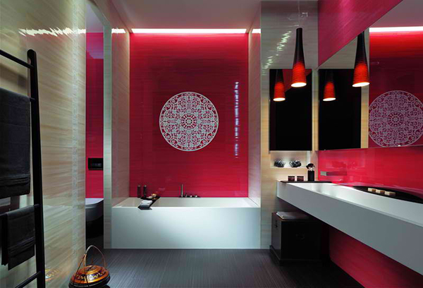 Admiramos especialmente el espectacular diseño de estos azulejos rojos del baño, así como la calma que emana el violeta.