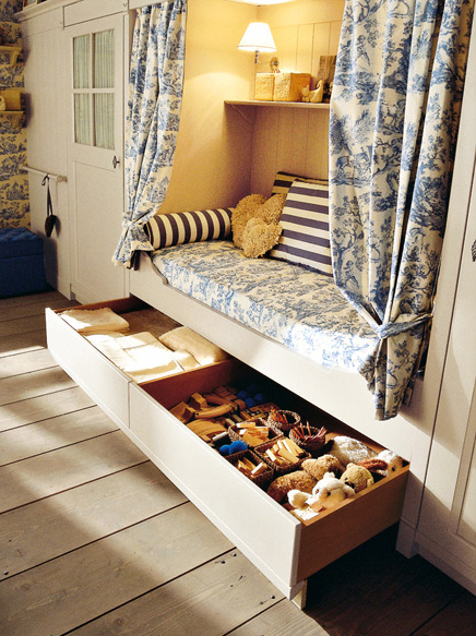 Pero el estilo distintivo de esta sala no es la única cosa que la hace especial. El diseño actual permite opciones flexibles. La cama está rodeada de armarios de almacenamiento en cada lado y un cajón deslizante debajo de la cama (un montón de espacio para guardar cosas y un rincón para dormir para cuando lleguen invitados).