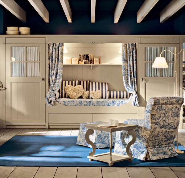 Las vigas de madera, la paleta de color azul y blanco, las puertas del armario y ventanas de estilo rústico, relajan el ambiente por lo que convierten al dormitorio en un espacio adecuado y atractivo para los niños,